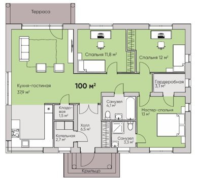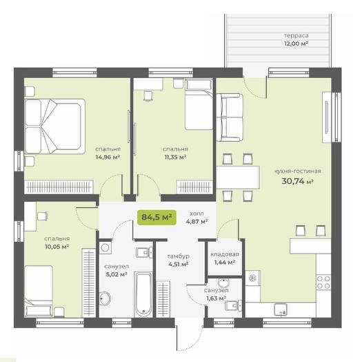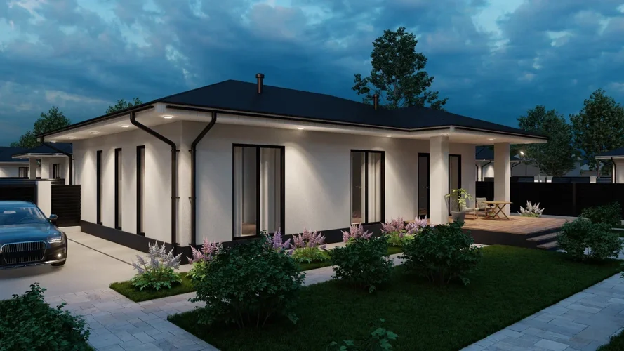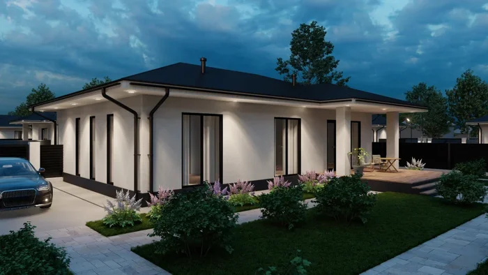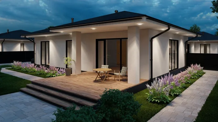 Септик, скважина, 2 спальни, 2 санузла, Высота потолка 2,95, Площадь family room 34,9 м2, Отделка white box. Есть дома из газоблока, силикатного блока и с дизайнерским ремонтом и мебелью