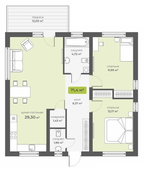 Септик, скважина, 2 спальни, 2 санузла, Высота потолка 2,95, Площадь family room 29,30 м2, Отделка white box