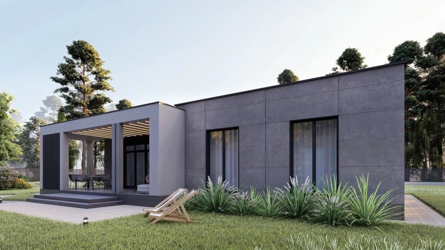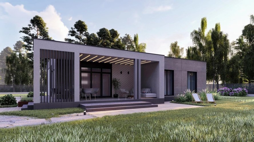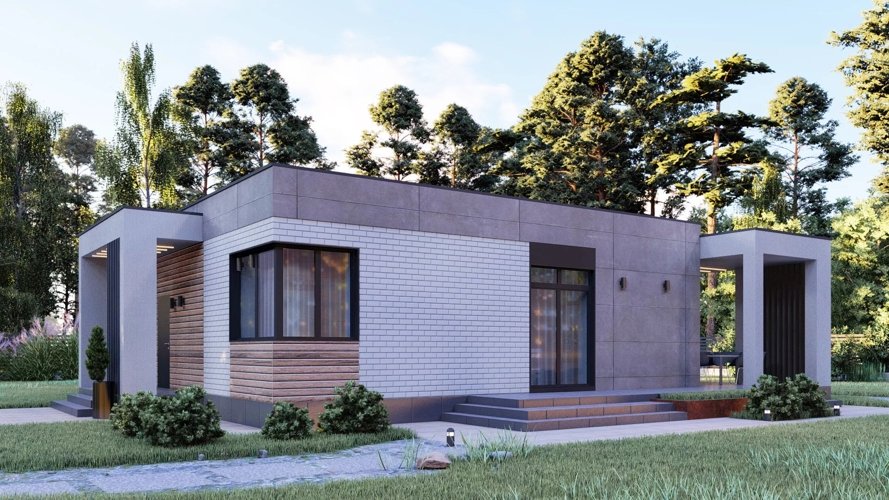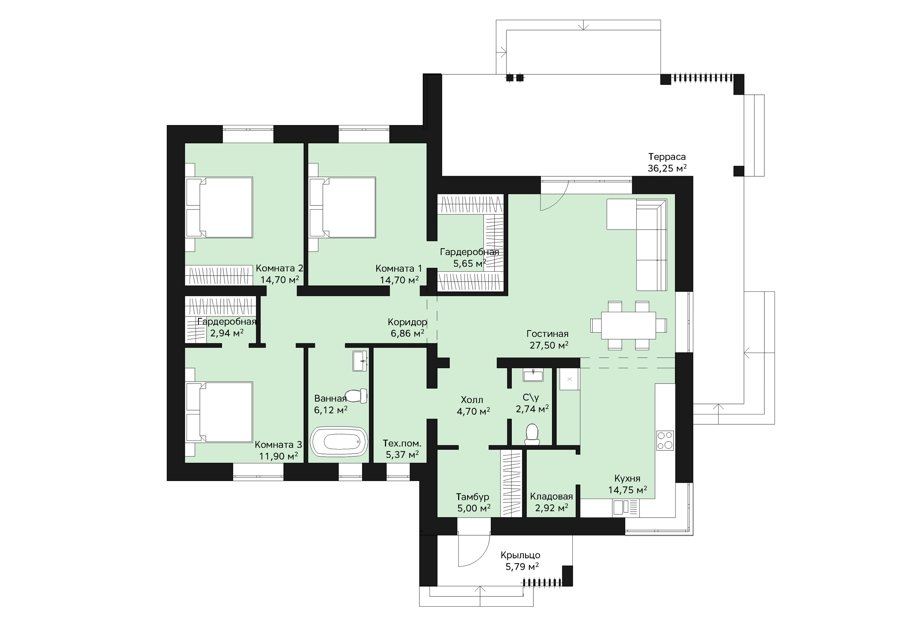 Внутренняя планировка делит пространство дома на две логичные функциональные зоны. Правое крыло занимает зона дневного пребывания. Она состоит из гостиной, столовой и кухни, которые совмещены в одно многофункциональное помещение. Обеденная часть этого помещения максимально приближена к кухонной, что позволяет обслуживать столовую с минимальными затратами сил и времени. Придомовая терраса гармонично расширяет гостевую зону и делает её оптимальной для проведения званых обедов, пикников и вечеринок.