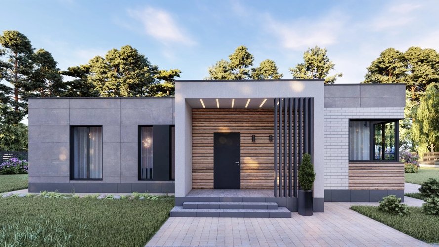 Проект предусматривает оснащение трех спальных комнат, двух гардеробных и удобной ванной. Входная группа дома состоит из маленькой прихожей и совмещенной с ней котельной.