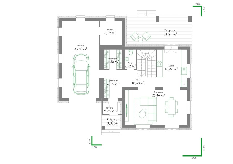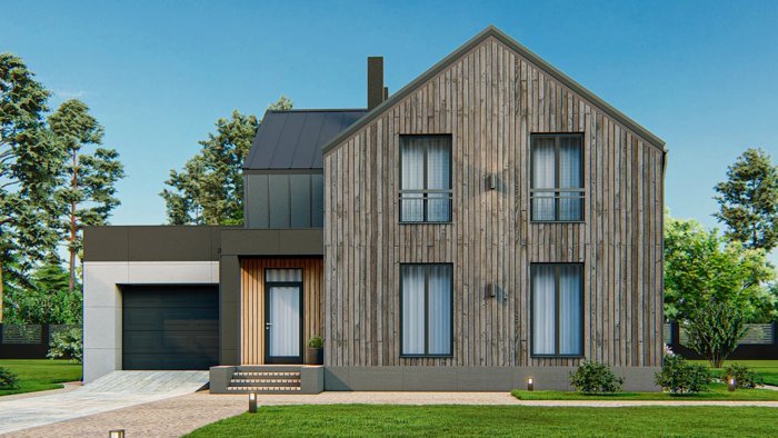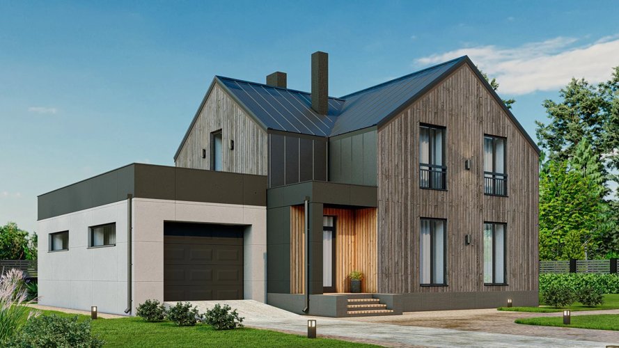 стоимостьЭркер в гостиной придает интересное объемное решение проекту. Из кухни есть выход на террасу - место для отдыха и встреч с гостями. В проекте предусмотрены три комнаты и четыре санузла, один из которых можно при желании переоборудовать в гардеробную или зону для хранения. К дому пристроен гараж. Этот проект прекрасно подойдет большой семье.